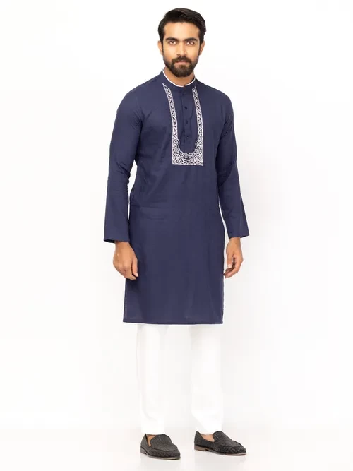 Midnight Blue Textured and Embroidered Cotton Slim Fit Panjabi